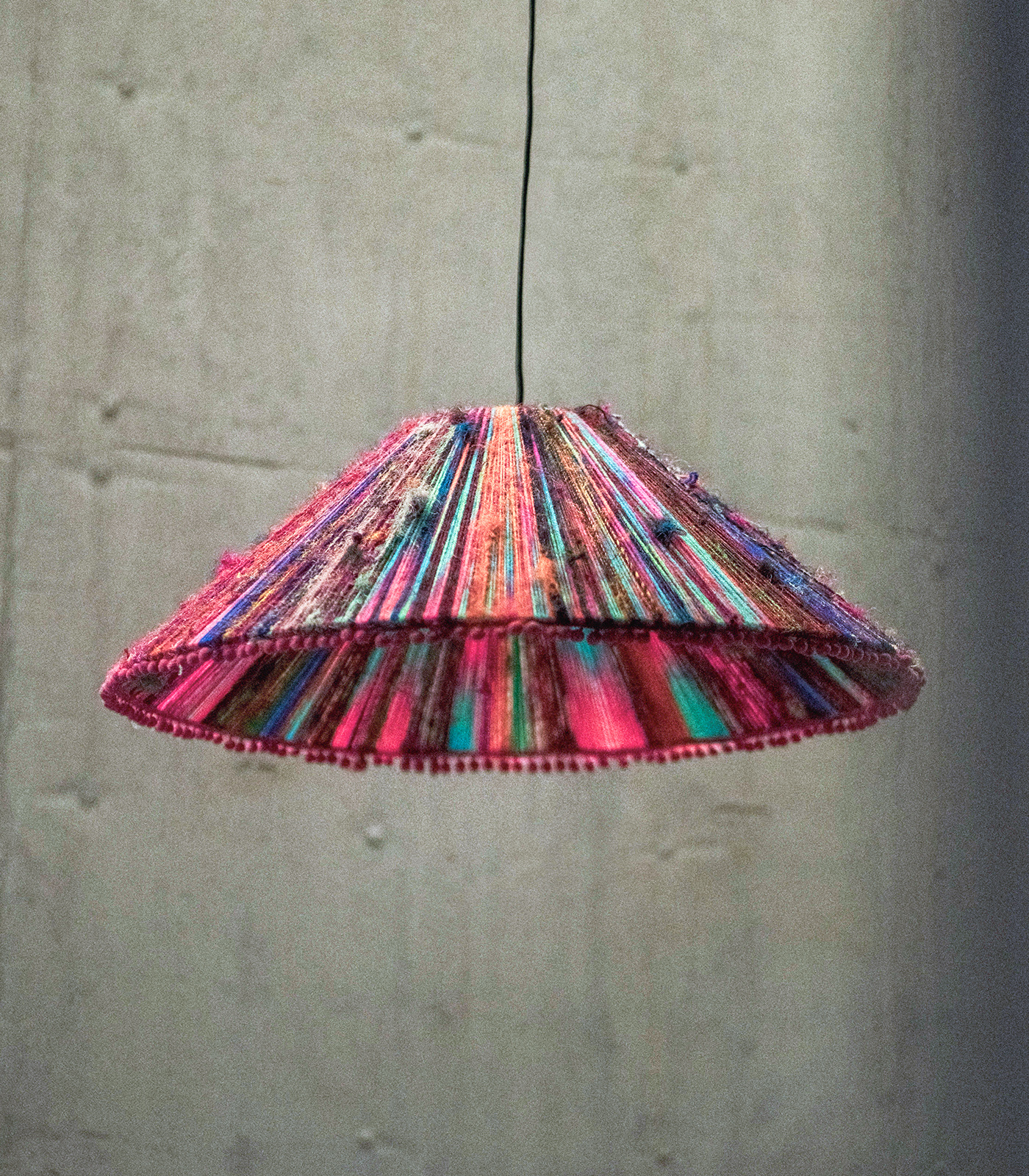 - ręcznie wykoanna z włóczki, sznurka tekstylnego oraz mini pomponów, na stalowym stelażu