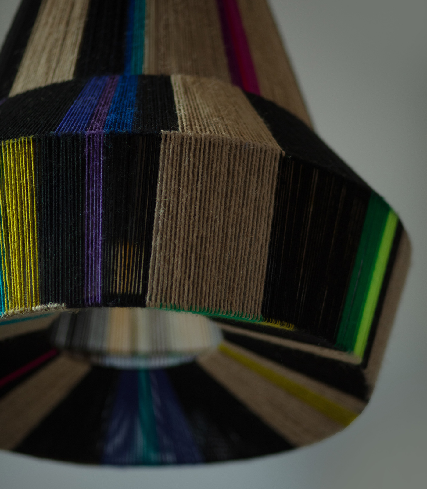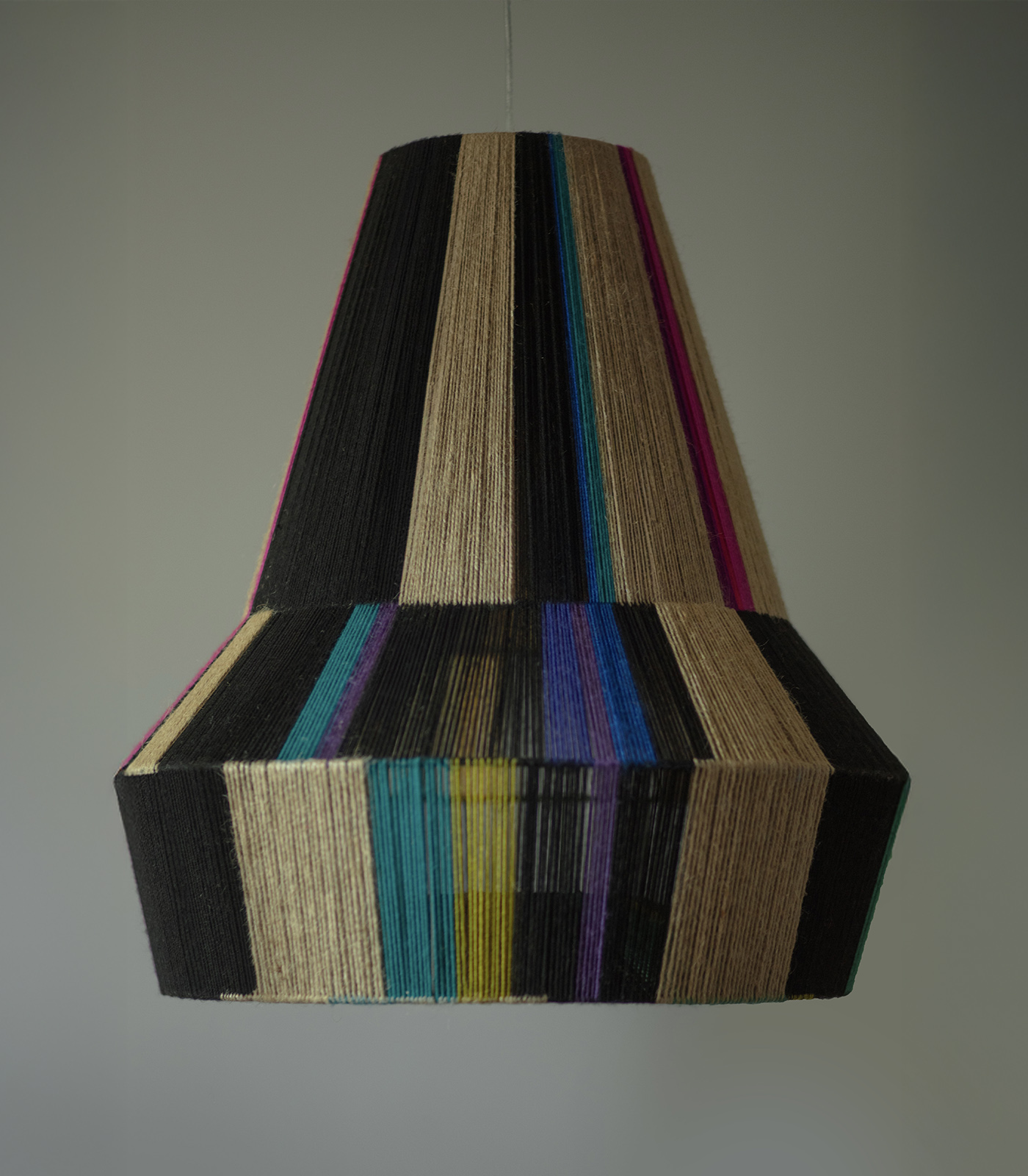 • ręcznie wykonana z włóczki i sznurka lnianego na stalowym stelażu